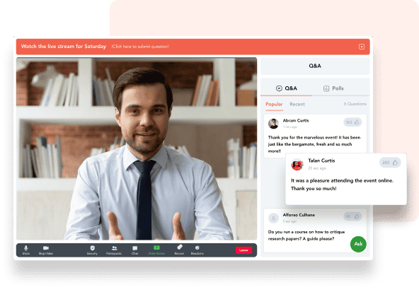 • Utilize an integrated webinar solution that includes breakout rooms, polls, Q&As, chat functionality, and more.