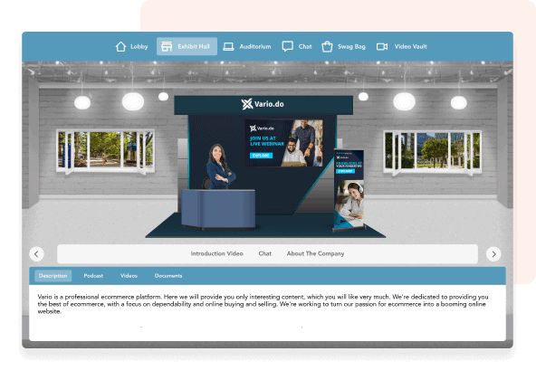 • Let exhibitors upload product catalogs, product demo videos and other resources to their branded exhibit booths.