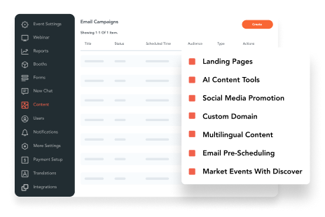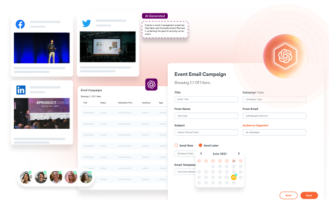 Quickly create high-quality event marketing content and easily plan your email and social media campaigns, landing pages, and other promotional materials. Promote your event with effortless email and social media marketing campaigns.