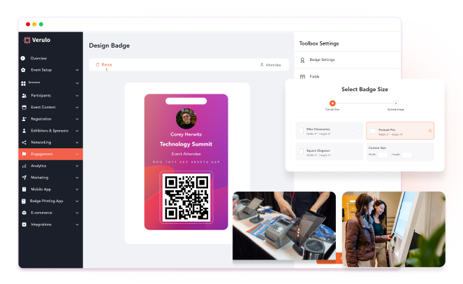 Easily create customized badges with attendee, speaker, or exhibitor names, logos, and other relevant information, and choose to instantly print badges onsite or bulk print pre-event.