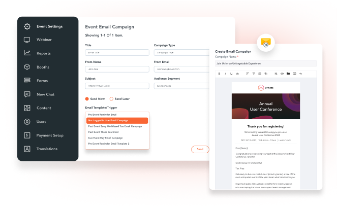 Keep your contacts in the loop throughout the entire event. vFairs’s email marketing features help planners communicate with attendees, exhibitors, speakers and event partners through customized, automated email campaigns.