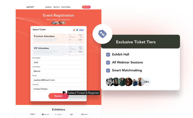 Create custom event registration forms to enhance the attendees' experience. vFairs offers a range of features, including creating multiple ticket types & tiers, and seamless payment collection through platforms like PayPal and Stripe.