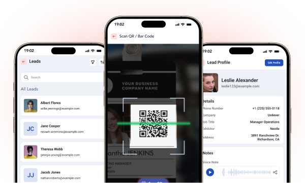 Our lead capture app helps exhibitors capture and manage onsite leads, and increase value for event participation. Scan QR codes or business cards, add tags, notes, and voice notes to create context, and assign new leads to booth reps for post-event follow-up.