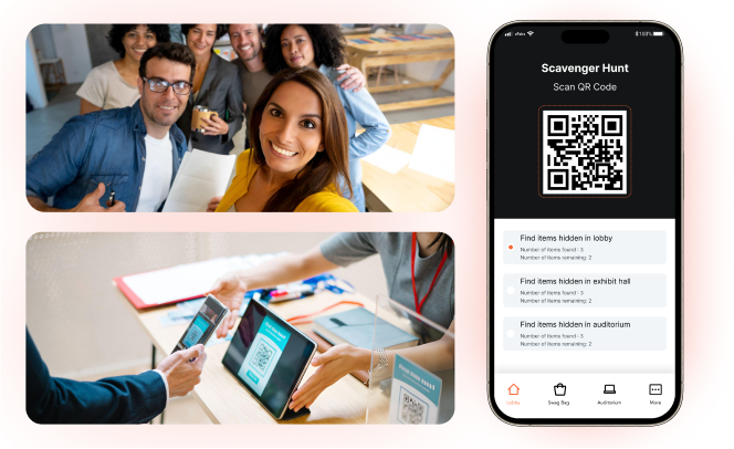 Lead attendees through the venue with a scavenger hunt. Onsite, set up QR codes for attendees to scan throughout your venue. Online, hide icons in your virtual environment that attendees can click to collect.