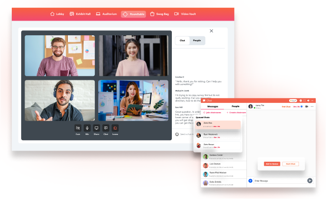 Facilitate connections onsite or online through mutli-functional chatrooms. Attendees, sponsors, and exhibitors can host 1:1 or group chats through text, audio or video calls. Chat participants can reply to chat threads, make notes, add tags, and more in order to stay organized in-event.