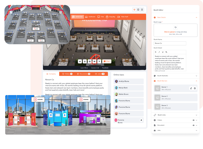 vFairs virtual exhibit hall features adapt to any event goal. From attendee engagement to giving exhibitors more value, deliver versatile experiences for every event whether trade shows, hiring events, or more.
